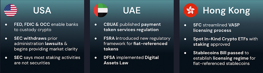 Regulatory tides have changed for the positive in key jurisdictions such as Hong Kong, the United Arab Emirates (UAE), and the United States. Examples include the SEC stating most staking activities are not securities in the USA, the CBUAE publishing payment token services regulation in the UAE, and Hong Kong approving Spot In-Kind Crypto ETFs with staking approved.